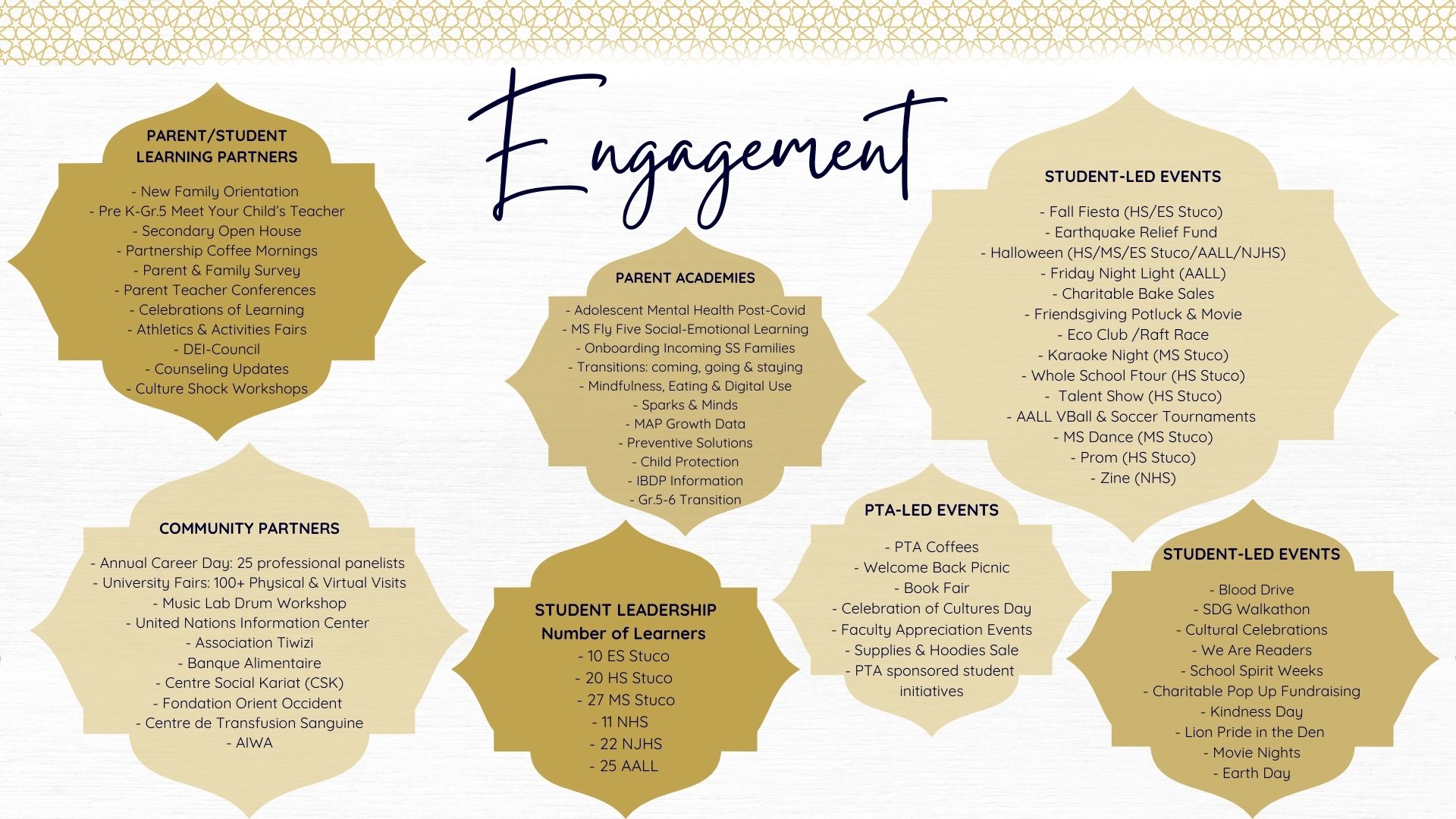 - Effectively communicate who we are, what we are doing, and why it matters. - Enhance home-school collaboration in support of learner growth and an inclusive community. - Build and nurture quality community and alumni partnerships for the benefit of all. | - Engage parents in the learning, celebration, feedback processes and activities to strengthen shared understanding of student personal and academic growth and RAS values.