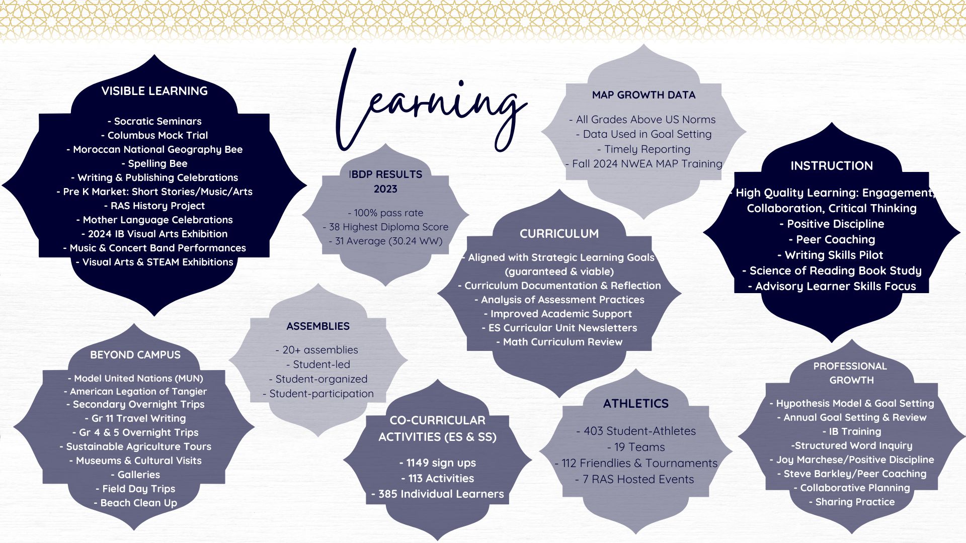 - Strengthen parent, alumni and community contributions (skills, energy, time) to increase learner opportunity, growth and achievement. - Expand our connections and relationships to Moroccan organizations and initiatives in number, quality and frequency to mutual benefit of RAS learners and the wider community. - Develop and refine consistent, engaging, relevant communications and platforms for all stakeholders which celebrate and demonstrate learning at RAS. |