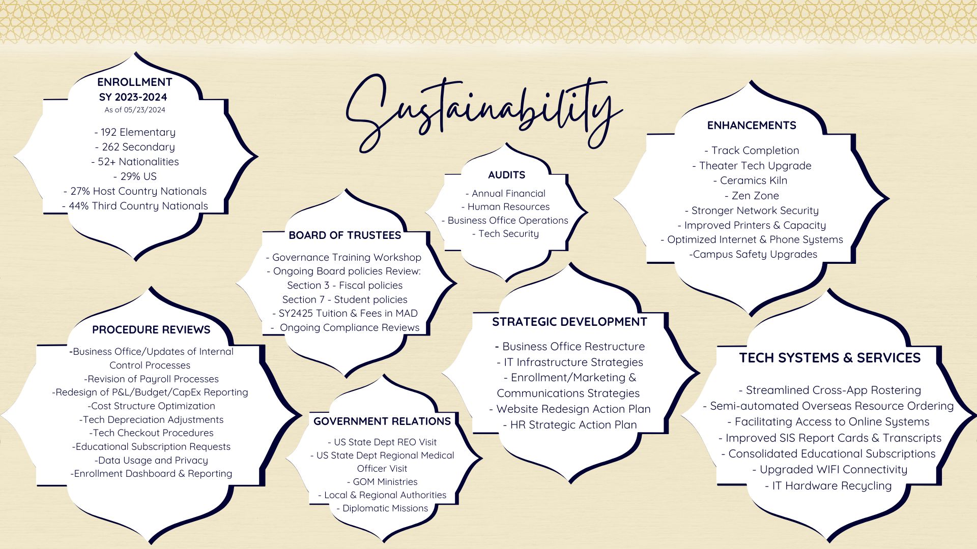 - Audit, evaluate and improve RAS business operations and reporting. - Integrate sustainable development goals in our curriculum and operations. - Develop a 5 year financial plan that ensures resources to achieve strategic priorities and long-term financial health. Sample |